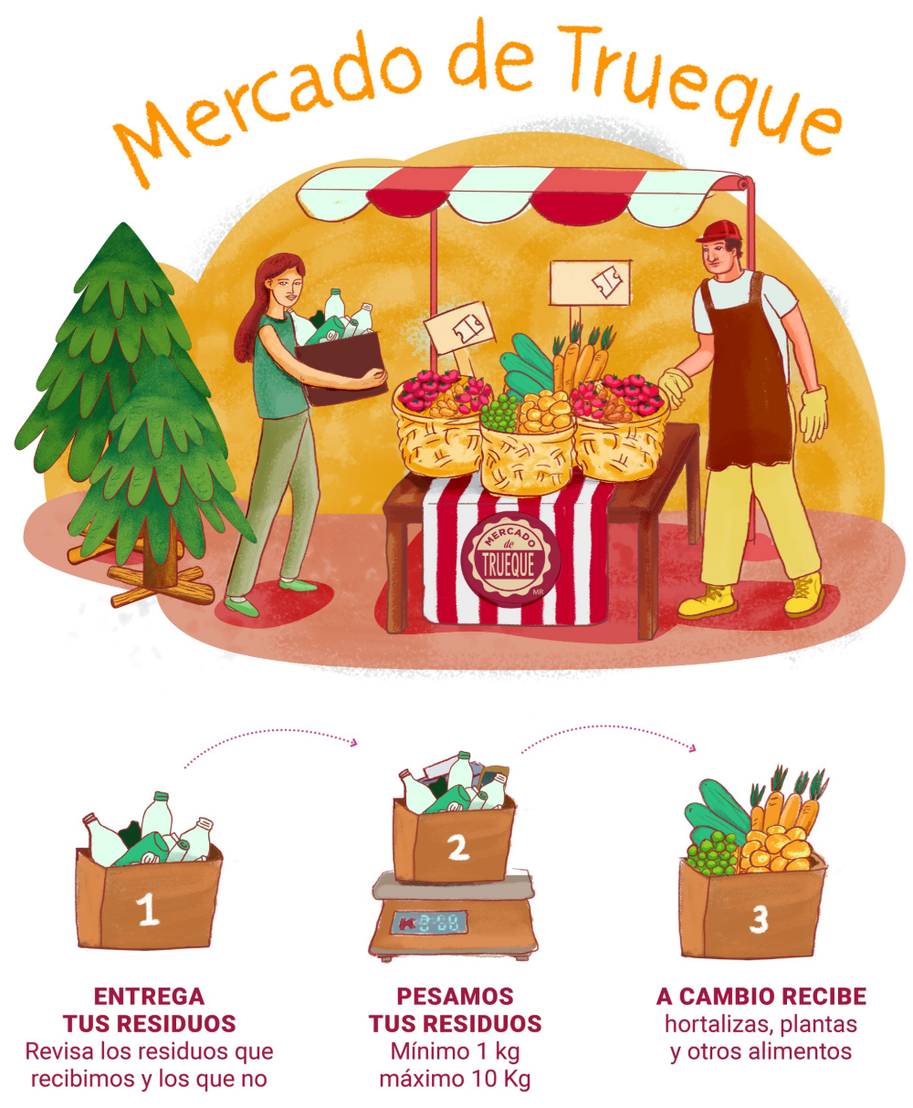 Mercado de Trueque es un intercambio de residuos sólidos reciclables limpios y ordenados, por artículos de primera necesidad, plantas, hortalizas y/o servicios. ¿Suena bien verdad?
